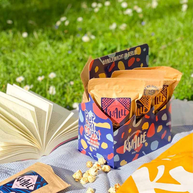 In Berlin darf man alles tragen, warum sollten es dann nicht einfach ein paar feine Tüten Popcorn sein? Der erste Eindruck zählt und mit sechs verschiedenen Knalle-Kreationen ist die knusprige Überraschung garantiert. Dieser extra Geschmacksträger ist ausnahmsweise mal aus Pappe. Damit hast du sechs unserer besten Kreationen in einer Hand. Zum Mitbringen, zum Verschenken, zum Teilen – denn gemeinsam schmeckts am besten!