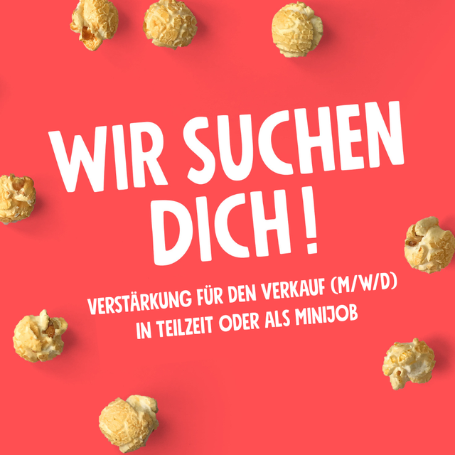 Du bist verKNALLT in Popkorn? Kundenkontakt lässt dein Herz aufpoppen? Dann bist du bei uns genau richtig! Wir suchen flexible und kommunikative Unterstützung für unseren Store. Hilf uns, aus jedem Besuch ein echtes Geschmackserlebnis zu machen!